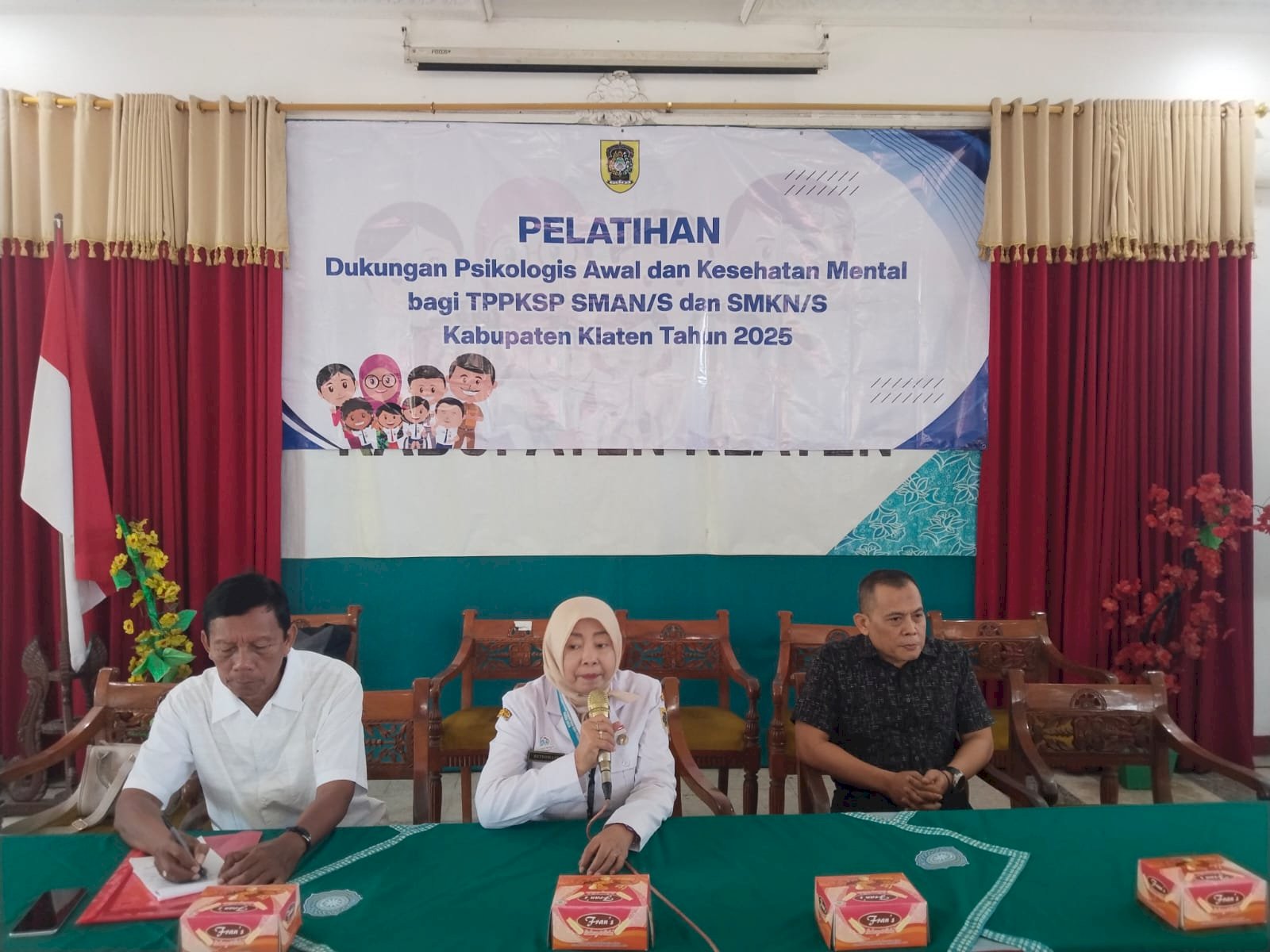 Dalam rangka meningkatkan kapasitas Tim Pencegahan dan Penanganan Kekerasan di Lingkungan Satuan Pendidikan (TPPKSP), maka DISSOSP3APPKB Kabupaten Klaten melalui Bidang PPPA menyelenggarakan kegiatan Pelatihan Dukungan Psikologis Awal dan Kesehatan Mental. Kegiatan dilaksanakan selama 2 hari pada tanggal 27 dan 28 Agustus dengan diikuti oleh Perwakilan TPPKSP SMA Negeri/Swasta dan SMK Negeri/Swasta.